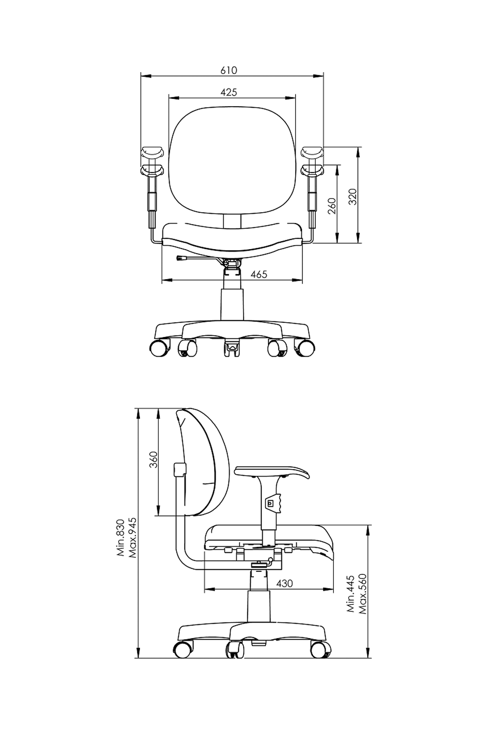 - Base giratória em aço tubular, com capa de proteção injetada e rodízio PP.