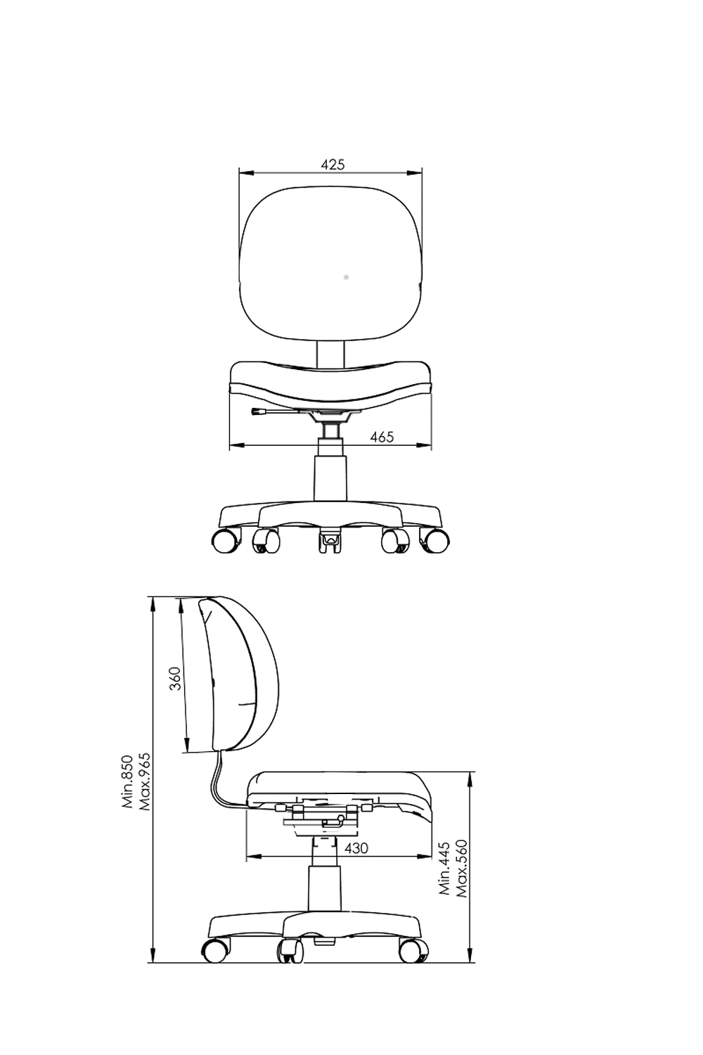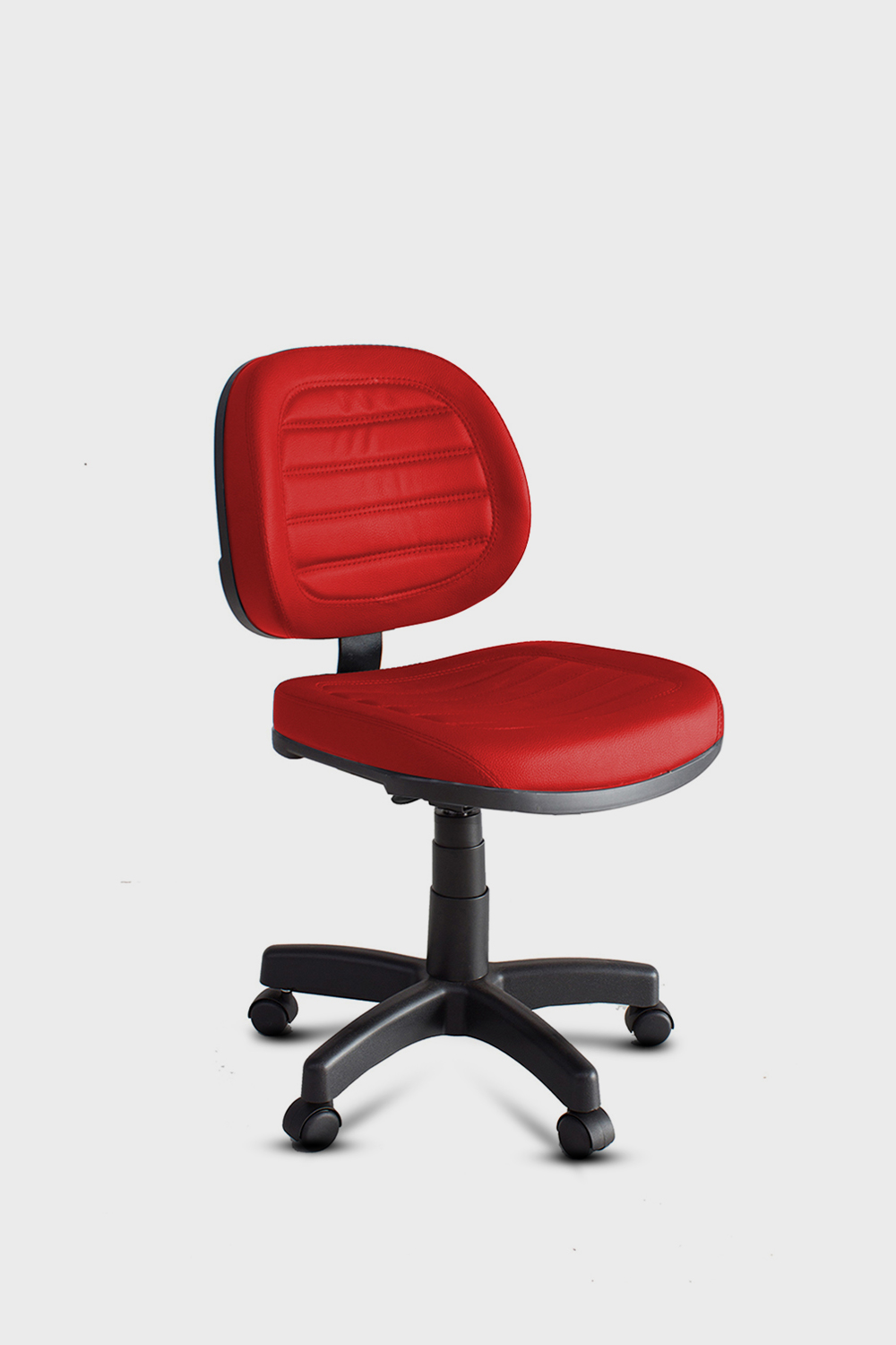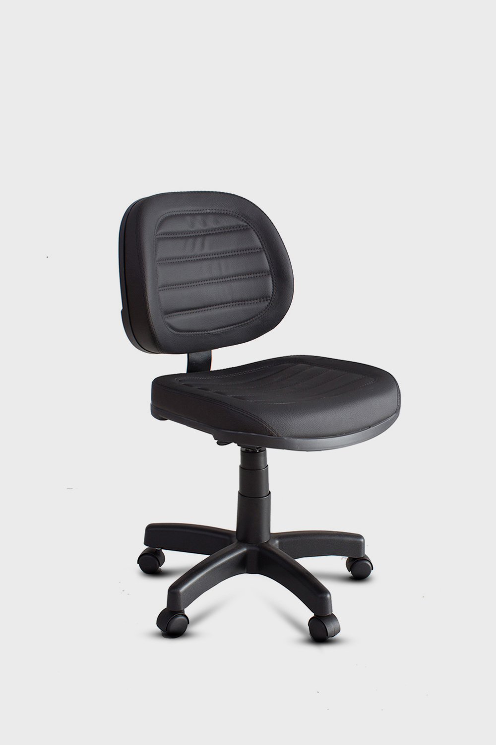 - Base giratória em aço tubular, com capa de proteção injetada e rodízio PP.