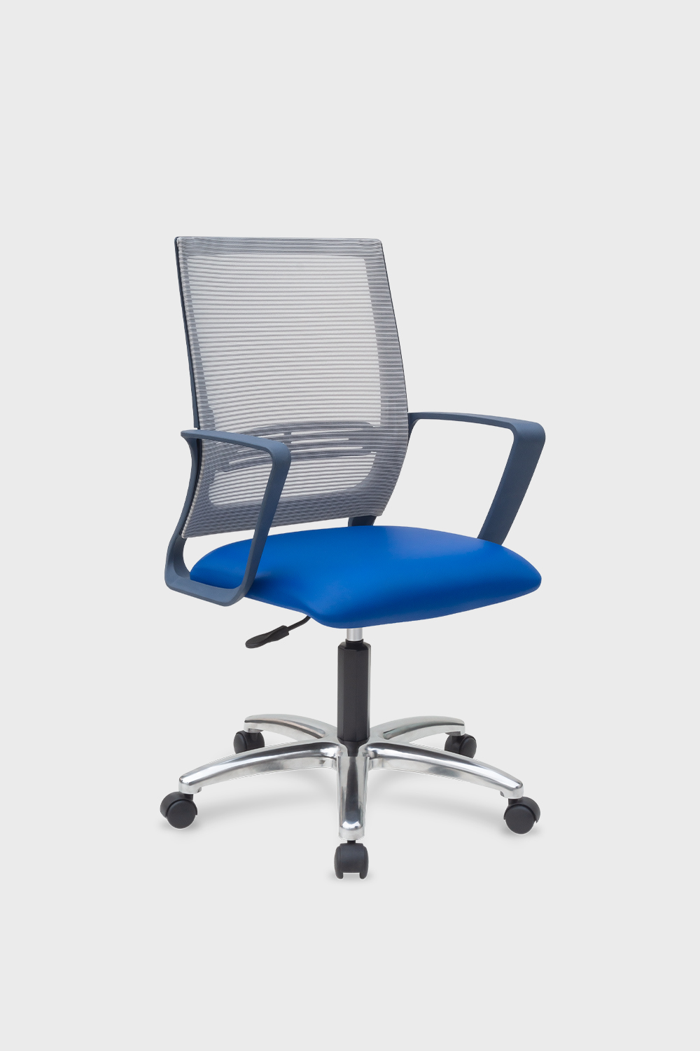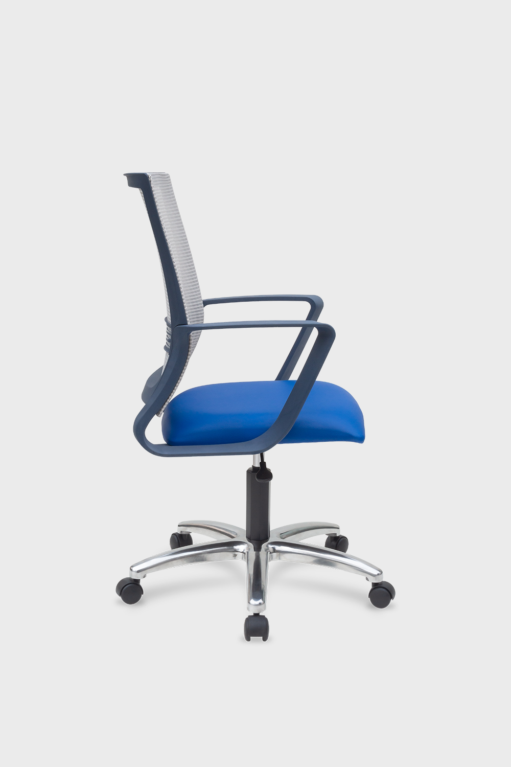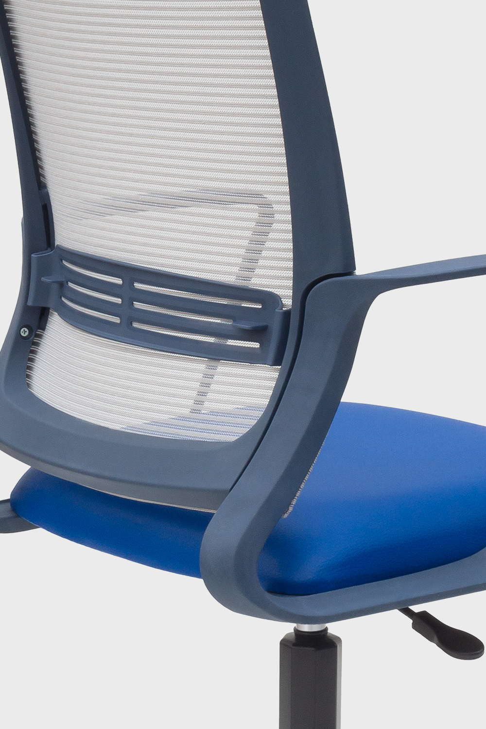 - Encosto com espaldar médio em tela 100% poliéster, com suporte de encosto em polipropileno com acabamento texturizado.