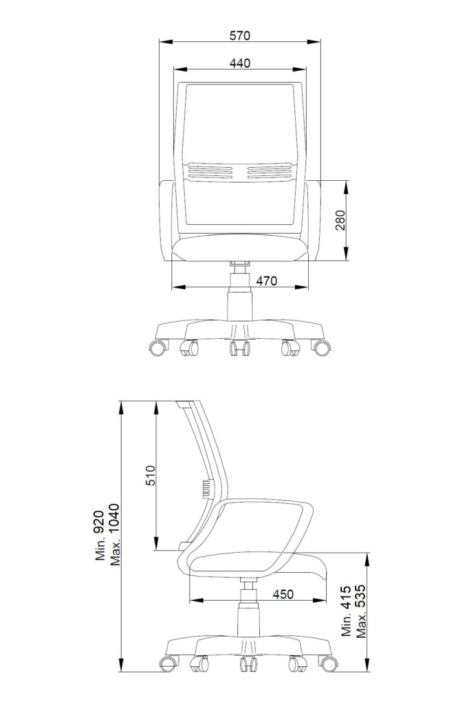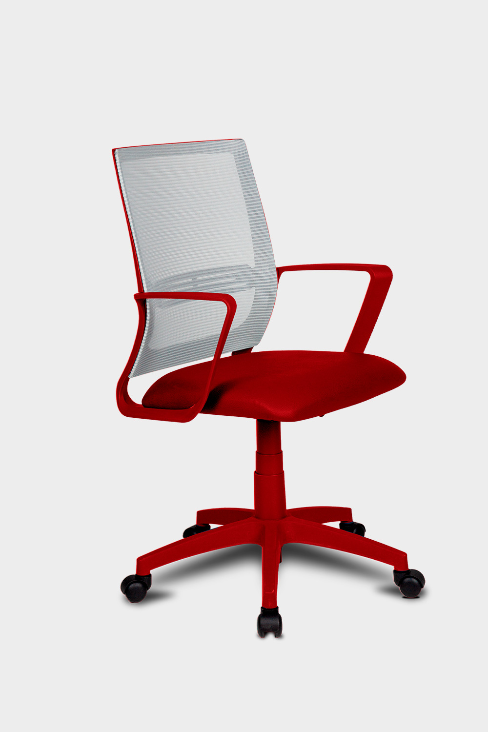- Encosto com espaldar médio em tela 100% poliéster, com suporte de encosto em polipropileno com acabamento texturizado.