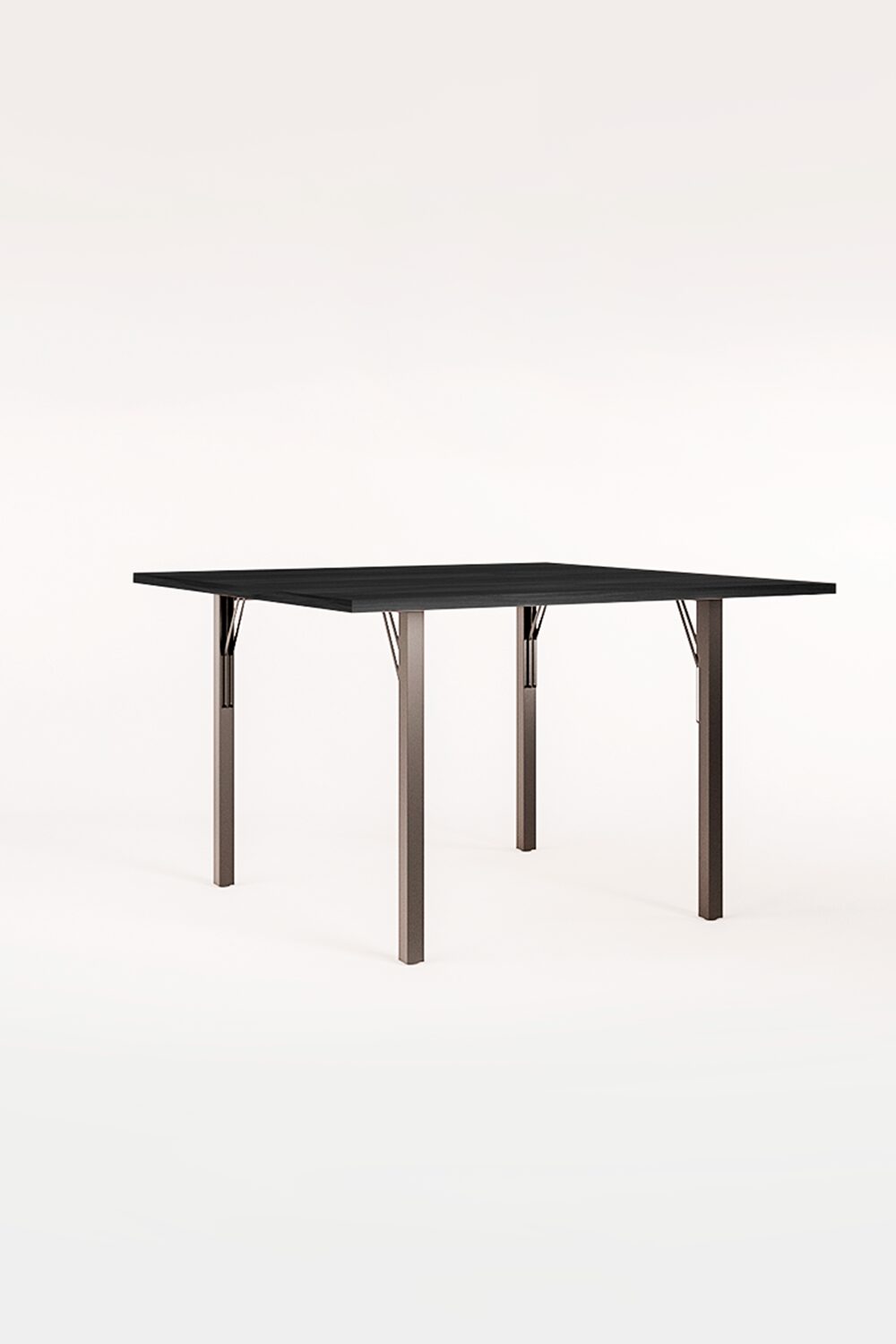 Mesa retangular 1200 x 1200 x 740mm, com tampo de 25mm, bordas (todo perímetro) em perfil de PVC . Estrutura metálica em tubo 40 x 40mm com sistema escamoteavel