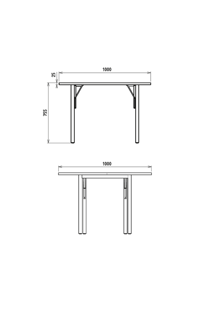 • Mesa retangular 1000 x 1000 x 740mm, com tampo de 25mm, bordas (todo perímetro) em perfil de PVC . Estrutura metálica em tubo 40 x 40mm com sistema escamoteavel