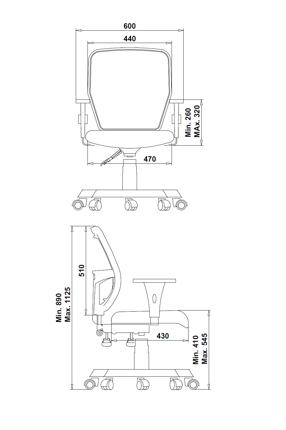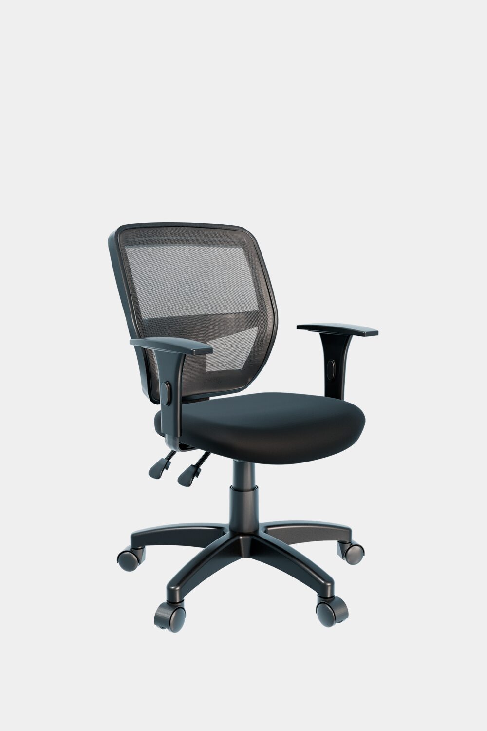 • Encosto com espaldar médio em tela 100% poliéster, com suporte de encosto em poliamida com acabamento texturizado.